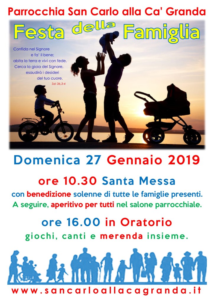 Domenica 27 gennaio grande appuntamento dedicato a tutte le famiglie! Alle ore 10:30 Santa Messa e benedizione di tutte le famiglie presenti. A seguire ci sarà un aperitivo per tutti nel salone parrocchiale. Ma la festa non finisce qui: dalle ore 16 in oratorio vi aspettiamo con tanti giochi, canti e merenda insieme! Non mancate!