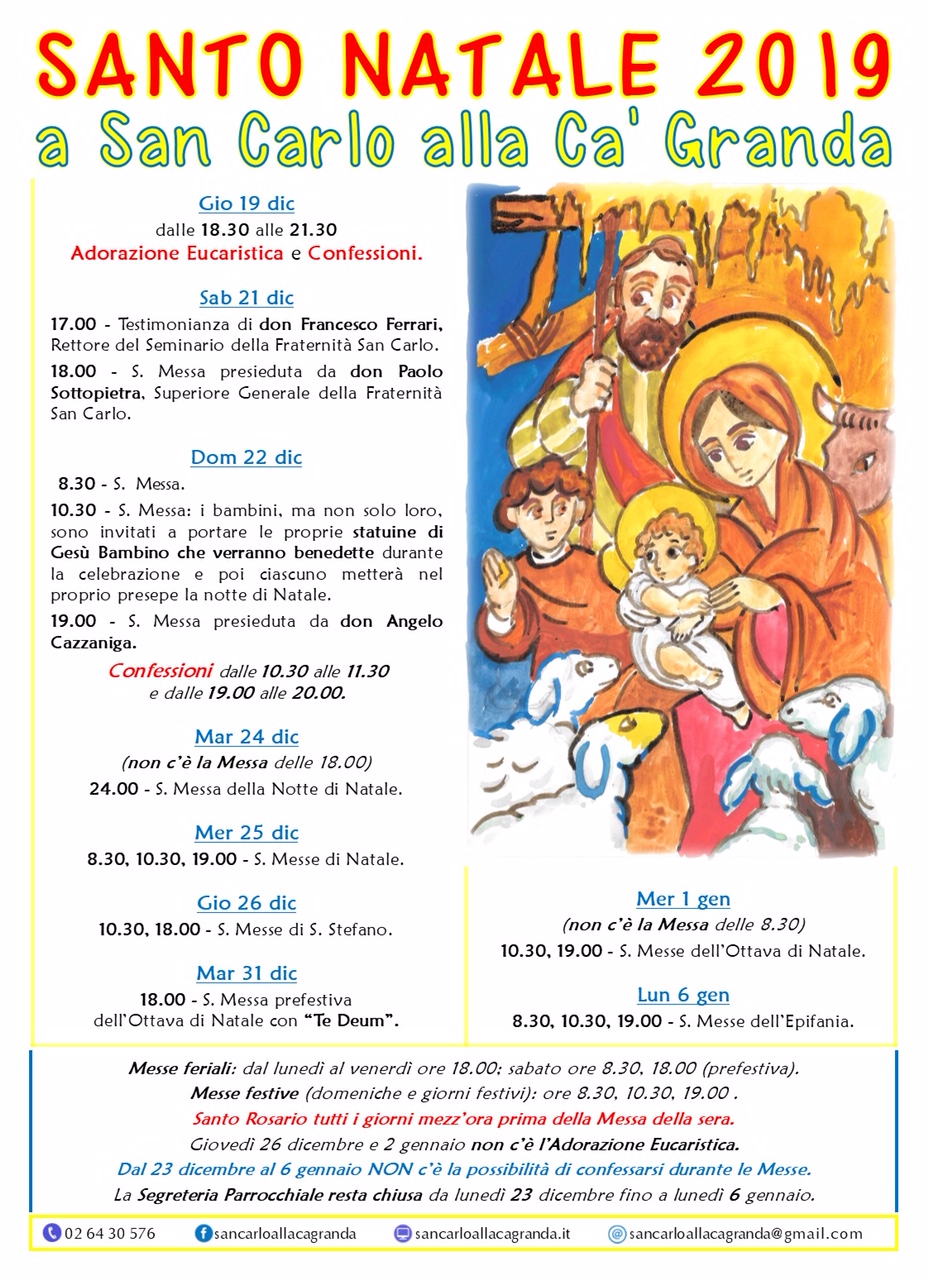Sabato 21 appuntamento con i sacerdoti e i seminaristi della Fraternità san Carlo. Alle ore 17: “Ti ho chiamato per nome”, testimonianza di don Francesco Ferrari, rettore del seminario. Alle ore 18: Santa Messa celebrata da don Paolo Sottopietra, superiore generale della Fraternità. Ore 19: Panettone e cioccolata per tutti!