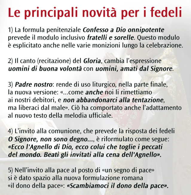 dalle messe di questa terza domenica d’Avvento anche nelle nostre comunità di Rito Ambrosiano entrerà in vigore il nuovo Rito della Santa Messa, così com’è stato deciso recentemente dalla CEI per il Rito Romano. La modifica introdotta per noi ambrosiani si completerà in un secondo momento con la promulgazione plenaria del nuovo Messale (il libro che contiene tutte le orazioni del sacerdote, i formulari delle messe, le preghiere eucaristiche e le risposte dell’assemblea). Qui sotto, dopo gli avvisi, potete leggere i cambiamenti che riguardano il popolo. Viviamo in comunione questo cambiamento, certi della grazia che ci viene data nella Santa Messa.