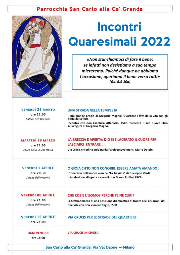 Venerdì 25 marzo alle ore 21, presso il salone dell’Oratorio, vi ricordiamo il quaresimale “Una Strada nella tempesta”. Incontro a cura di don Gianluca Attanasio che presenterà il suo nuovo libro sulla figura di Gregorio Magno. Clicca qui per consultare il programma completo di tutti i Quaresimali.