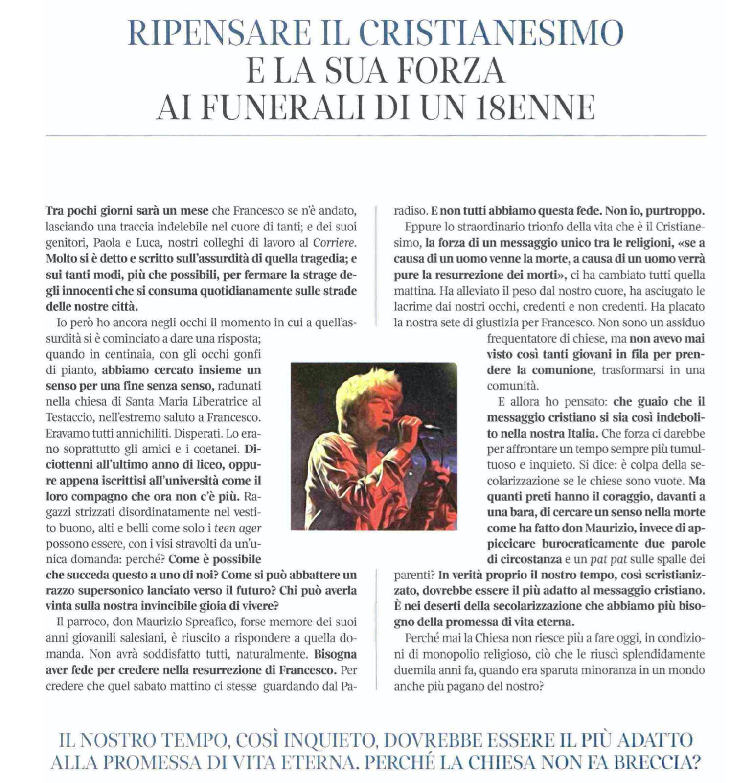 con questa newsletter infrasettimanale desideriamo segnalarvi l’articolo (clicca qui) di Antonio Polito, pubblicato su Sette, dal titolo “Ripensare il Cristianesimo e la sua forza ai funerali di un 18enne”.
