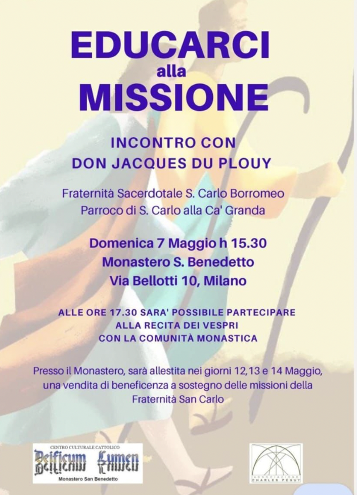 Domenica 7 maggio alle ore 15:30, presso il Monastero di San Benedetto in via Bellotti 10 a Milano, il nostro don Jacques terrà un incontro dal titolo “Educarci alla missione”. Clicca qui per la locandina dell’evento