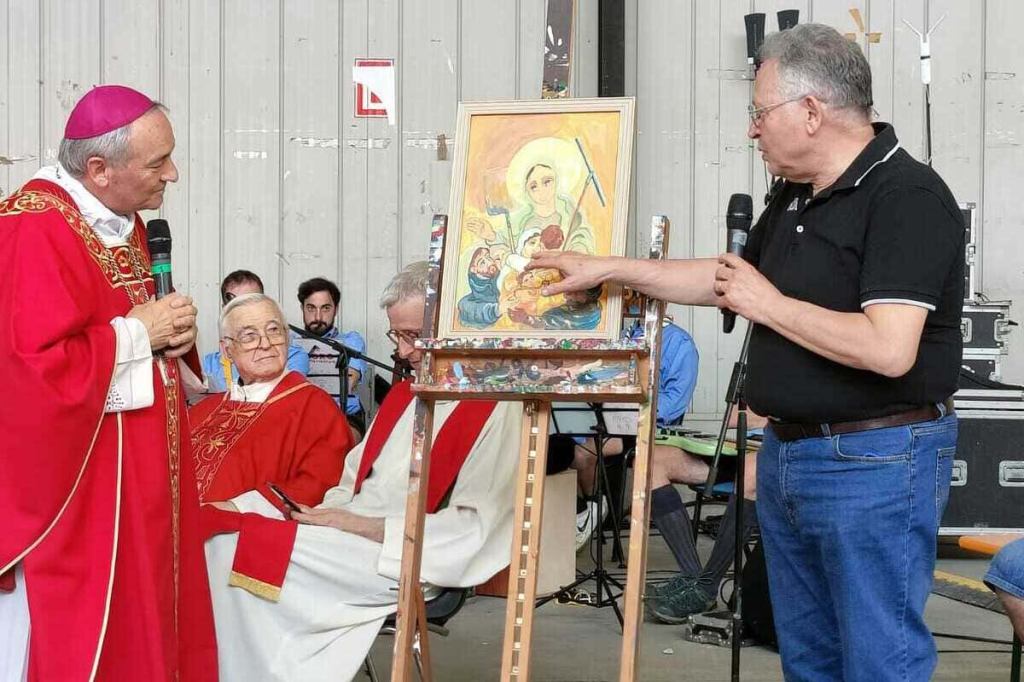 Vi trasmetto il saluto degli amici di Forlì e il racconto di Franco Vignazia, l’autore del quadro che vedete nella prima immagine che lui stesso ha intitolato La Madonna del Fango ed ha presentato al Vescovo di Forlì Livio Corazza.