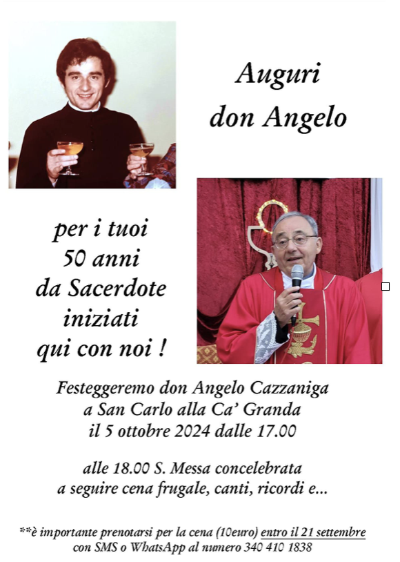 vi annuncio con anticipo che sabato prossimo, 5 ottobre, già a partire dalle 17 e includendo la messa prefestiva delle 18, celebreremo il 50esimo di ordinazione sacerdotale di don Angelo Cazzaniga, uno dei primi coadiutori di questa parrocchia.