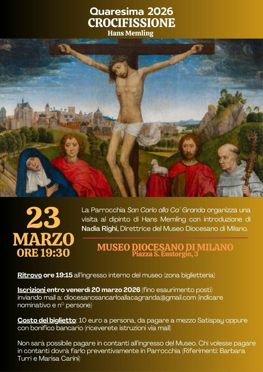 23 marzo, ore 19:30, presso il museo diocesano (piazza San Eustorgio 3), visita al capolavoro di Hans Memling «La Crocifissione», con introduzione della Dott.ssa Nadia Righi, direttrice del museo. Clicca qui per consultare la locandina e le modalità di iscrizione.